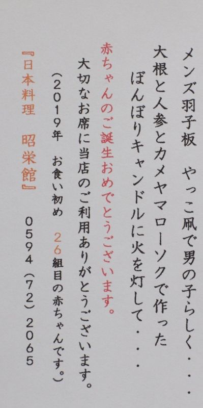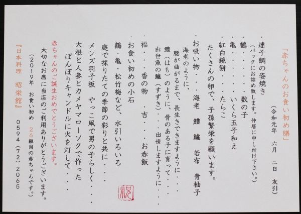 大切な赤ちゃんのお食い初めのお席は、是非 いなべの昭栄館へ~。