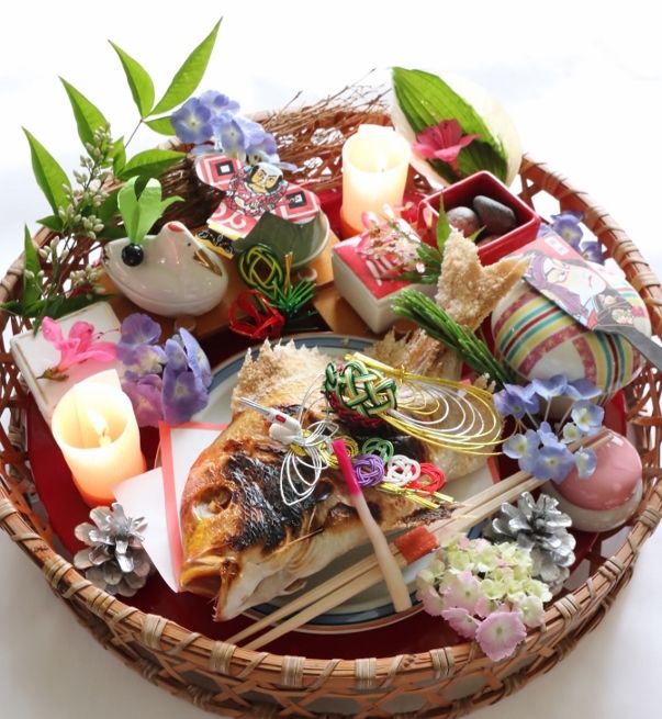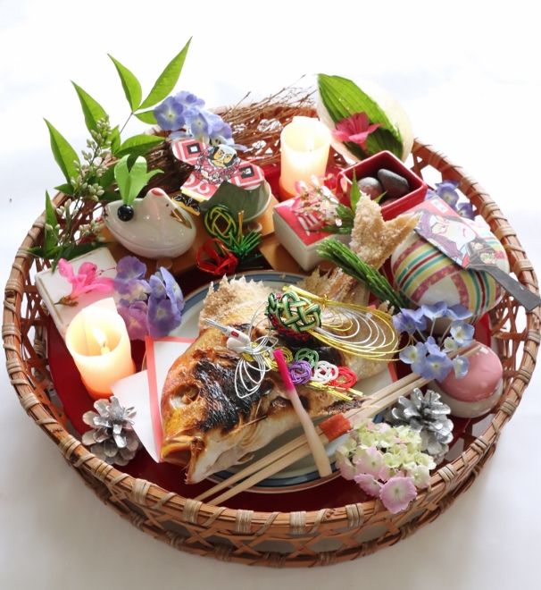 おめでたい朱籠に、連子鯛の姿焼きを中心に、
