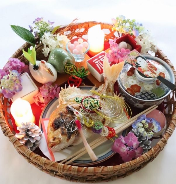 おめでたい朱籠に、連子鯛の姿焼きを中心に、