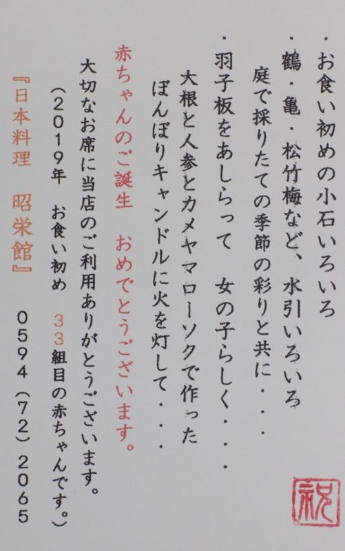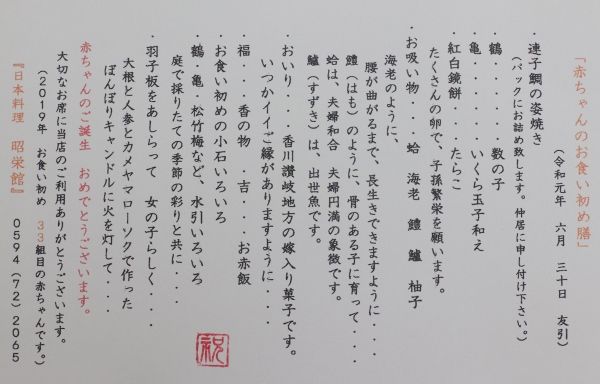 大切な赤ちゃんのお食い初めのお席は、是非 いなべの昭栄館へ~。