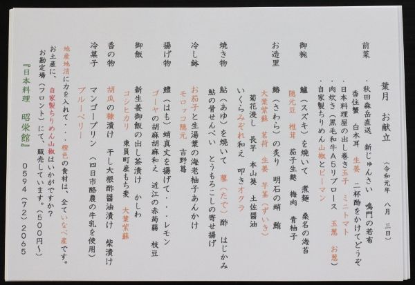 「料理長の日記」  三重県いなべ市             阿下喜(あげき)の日本料理 昭栄館