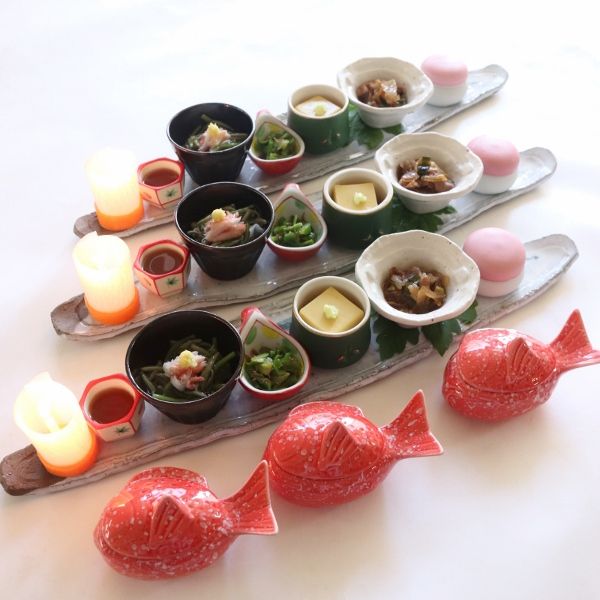 鯛の器 紅白鏡餅の器など、おめでたく盛り合わせました。