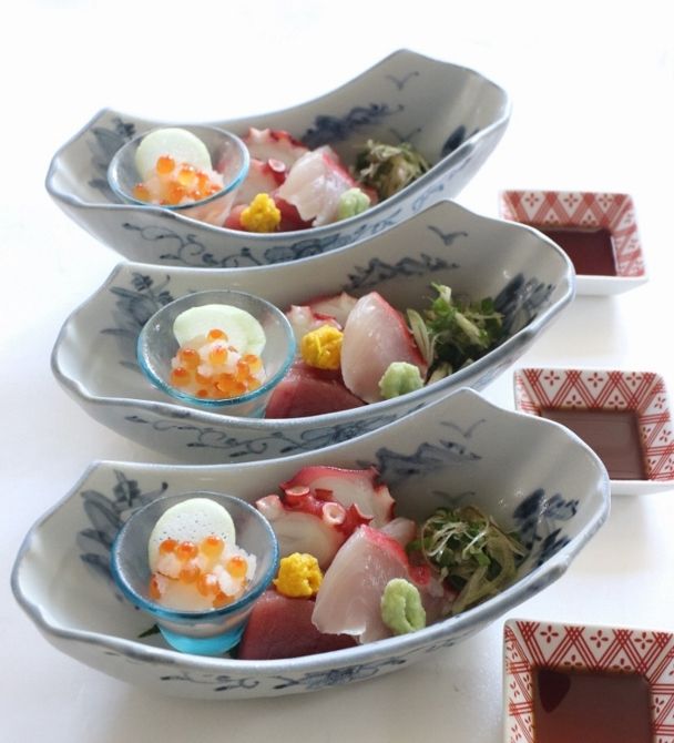 明石のたこ 金目鯛の湯霜 まぐろ いくらみぞれ和えの盛り合わせ。