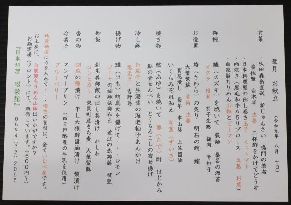 「料理長の日記」  三重県いなべ市             阿下喜(あげき)の日本料理 昭栄館