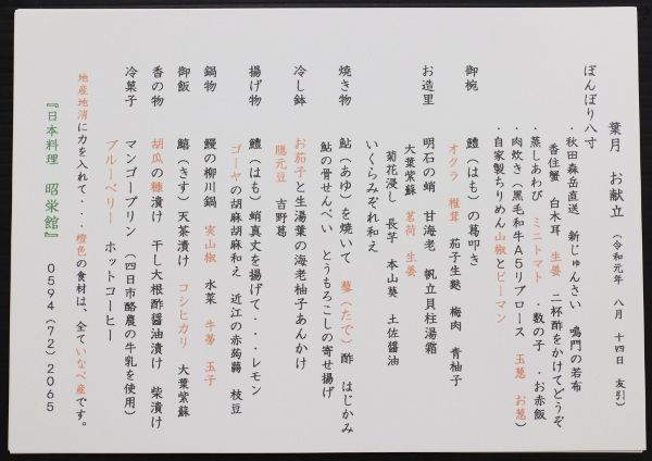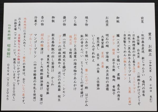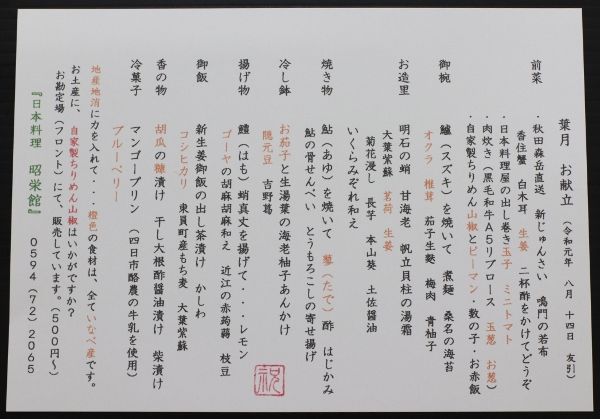 「料理長の日記」  三重県いなべ市             阿下喜(あげき)の日本料理 昭栄館