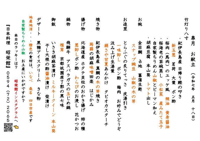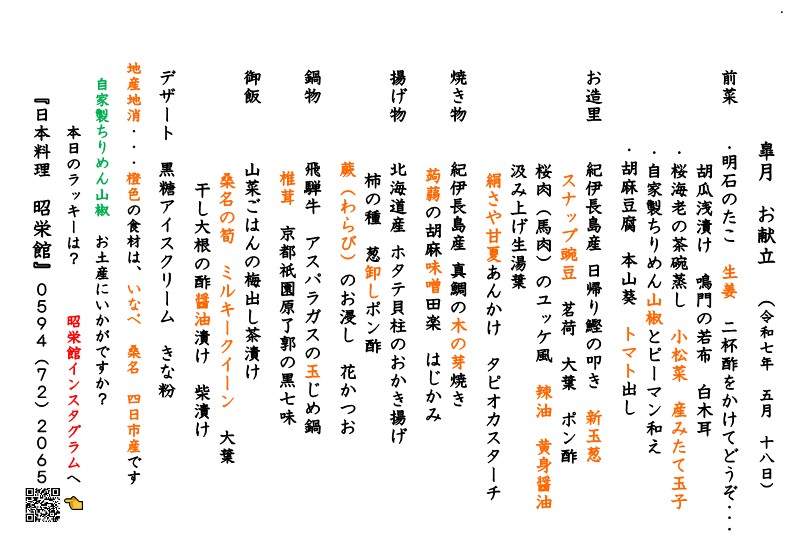 「料理長の日記」  三重県いなべ市             阿下喜(あげき)の日本料理 昭栄館