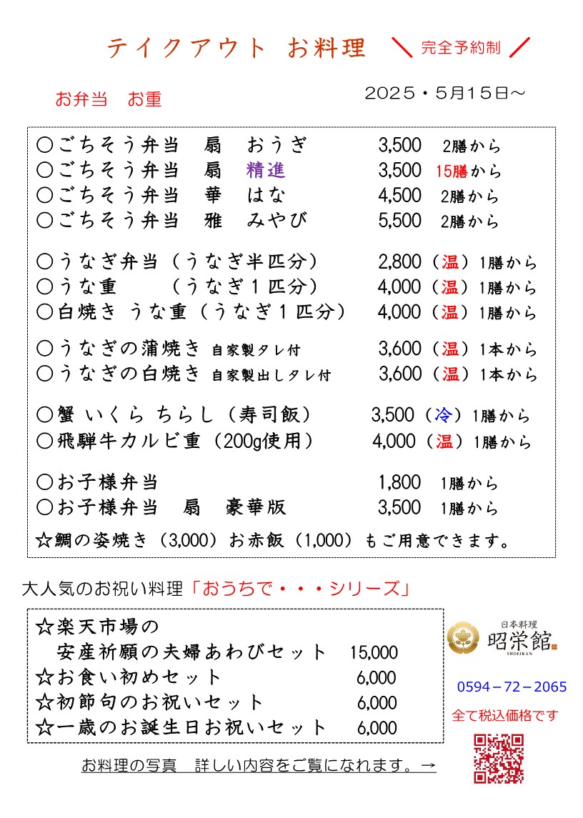 ↑ 現在の  テイクアウトお料理のラインナップ です。