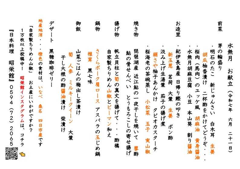 「料理長の日記」  三重県いなべ市             阿下喜(あげき)の日本料理 昭栄館