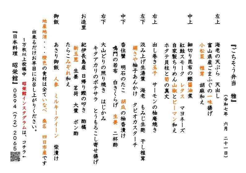 「ごちそう弁当 雅 5,500円」 のお献立です。