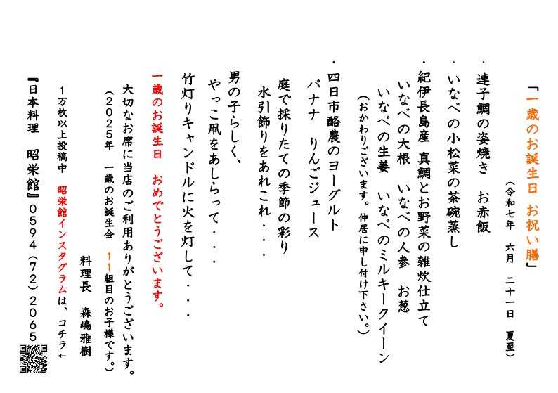 一歳のお誕生日お祝い膳(3,800円 税込)のお献立です。