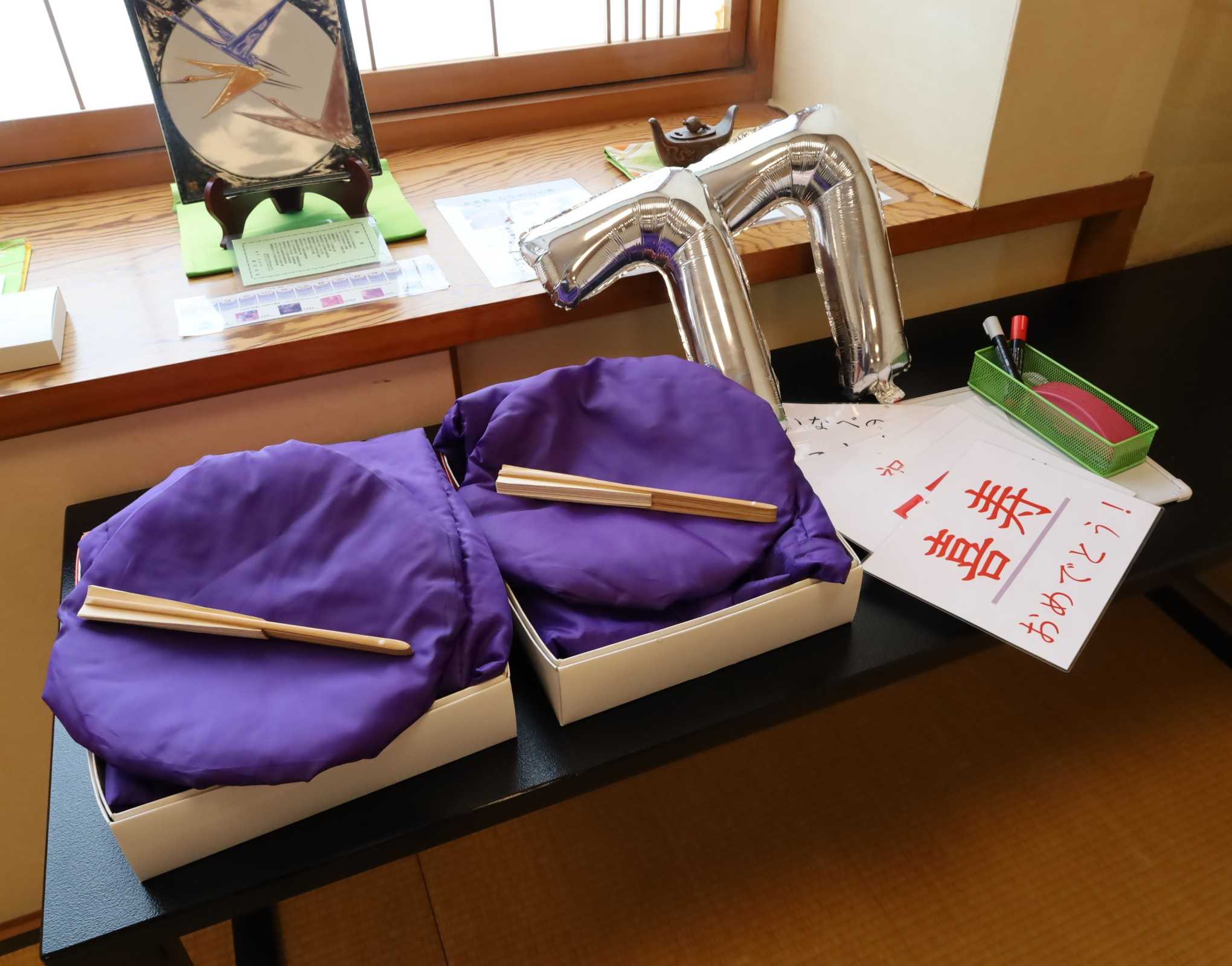 喜寿祝いの 紫色のちゃんちゃんこ をご夫婦でお召しになり
