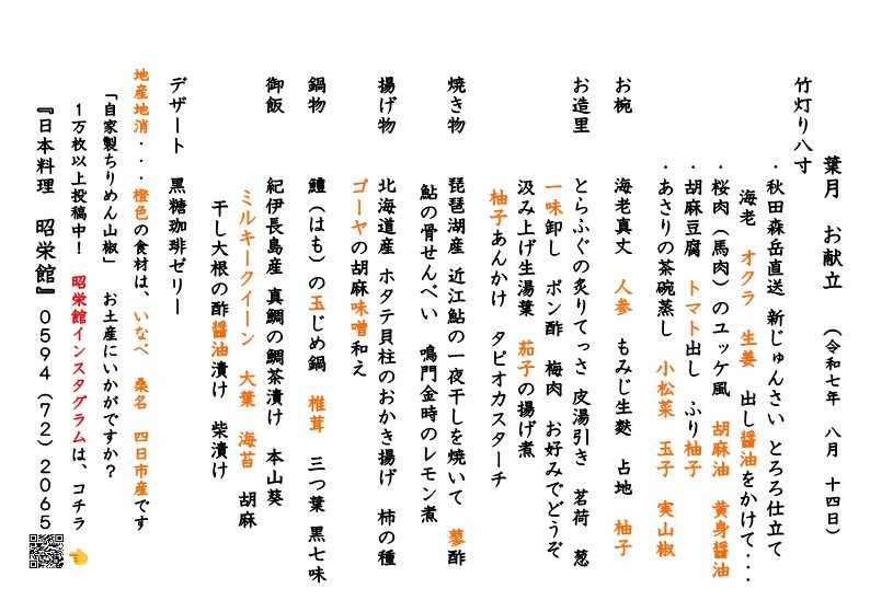 「料理長の日記」  三重県いなべ市             阿下喜(あげき)の日本料理 昭栄館