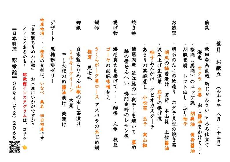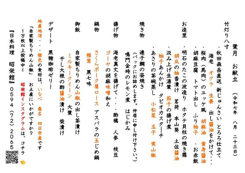 「料理長の日記」  三重県いなべ市             阿下喜(あげき)の日本料理 昭栄館