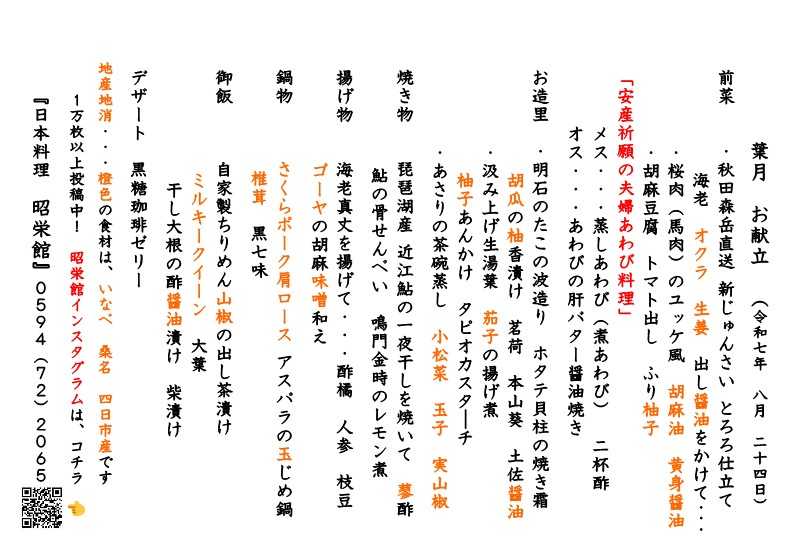 「料理長の日記」 三重県いなべ市 阿下喜(あげき)の日本料理 昭栄館