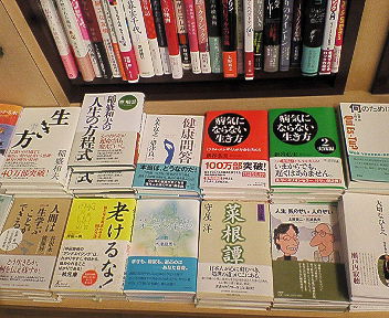 皆さん、こんにちは。今日、会社近くの本屋さんに行くと、兄の本が平台に積んでありました。しかも入ってすぐのいい場所に。前に兄のブログで、五木寛之さんの「何のために生きるのか?」と、兄の本の帯に推薦文を書いていただいた帯津良一先生と五木先生の共著本「健康問答」、そして兄の本の3点セットで・・・というような記事がありましたが、その「健康問答」のそばに置いてありました。店長さん、ナイスな配置に感謝です。他の本屋さんも、こういう売り方してくれると嬉しいのですが・・・。本屋の皆さん、宜しくです。何のために生き、死ぬの?