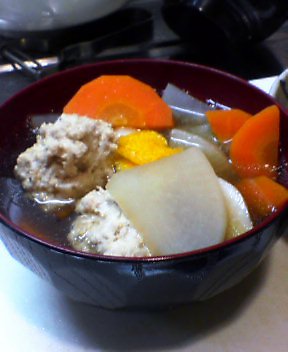 今年は一人で正月を過ごすことになったので、おかんに山田家のレシピを聞いて雑煮を作ってみることに。【材料】・ダシ:昆布、鰹節・具 :にんじん、大根、里芋(下茹でしてヌメリをとる)、 ごぼう、鶏モモ肉・調味料:しょうゆ、塩、酒、みりん、ゆずの皮・もち:サトウの切り餅1.昆布と鰹節でダシを取る。2.だし汁を火にかけ、沸騰したら具を入れて煮る。3.調味料で味付け。4.沸騰してるところにモチを入れて2分待つ。5.器によそい、ゆずの皮を乗っけて出来上がり。というのがオフクロレシピ。今回はめんどくさいのでダシは昆布と本ダシ、ごぼうは入れない。 さらに昨日作った鶏団子があまってたので鶏肉の代わりに使う。うーん、結局山田家の雑煮とは全く別のものに仕上がってしまった。それなりにうまかったけどね。ちょっとホームシック。
