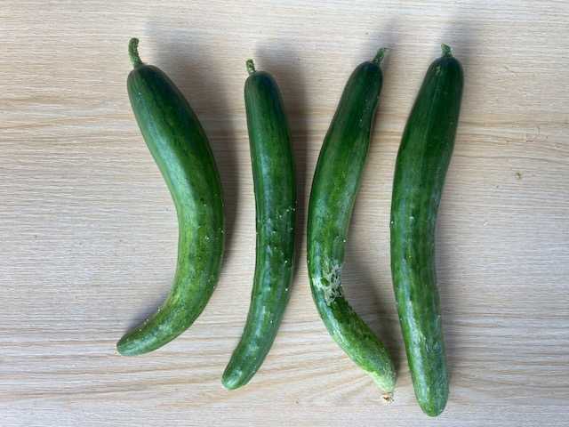 ◇収穫したキュウリです。ちょっと頼りない形をしています。
