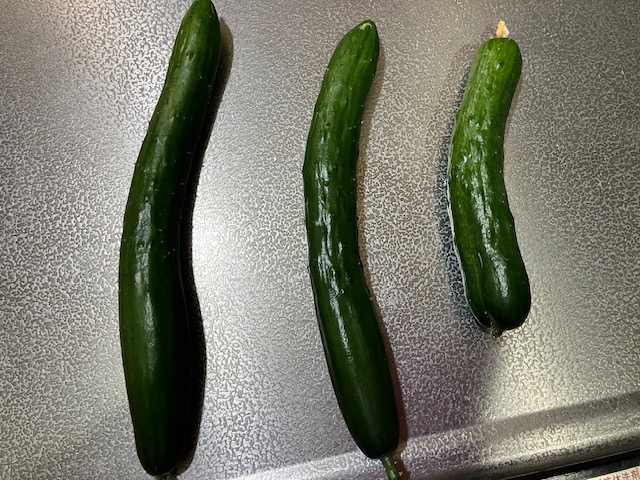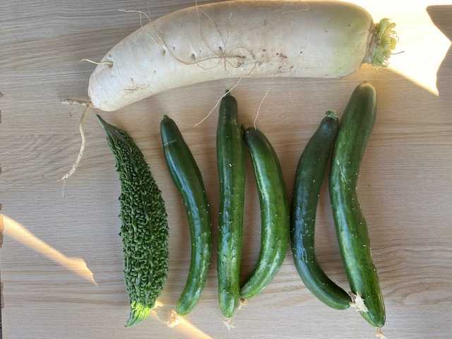 この期間に収穫した枝豆とキュウリです。枝豆は最後の収穫です。キュウリは、夏ほどの勢いはありませんが、1日平均2~3本収穫できています。