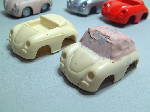 先日、のらさんから送っていただいた356Aスピードスターの複製品をモディファイしてリクエストがあった、ポルシェ356Aのクーペモデルの製作も始めました。ルーフ部分にパテを盛って、シャーシ部分もフラットモーター仕様(オープンモデル)からショートベースのSTDモーター仕様へ同時進行で356Cのクーペモデルと並行して進めて行く予定です