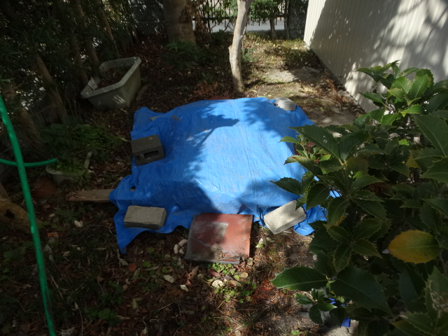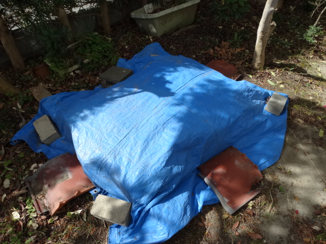 更にブルーシートをかけて風で飛ばされないように隅々へ重しを置きます。