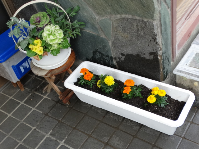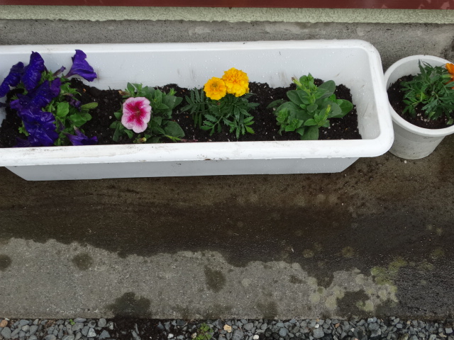 急遽予定変更して玄関前にコンテナを置いて花を植えました^^