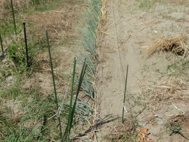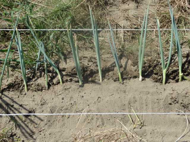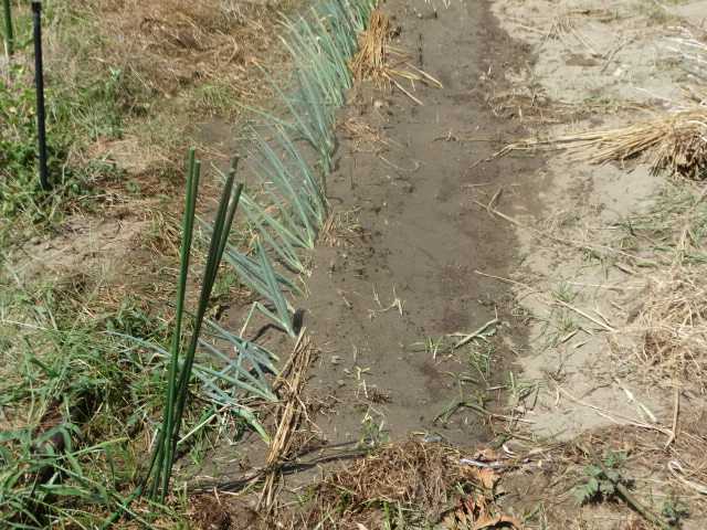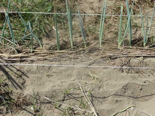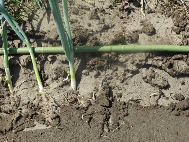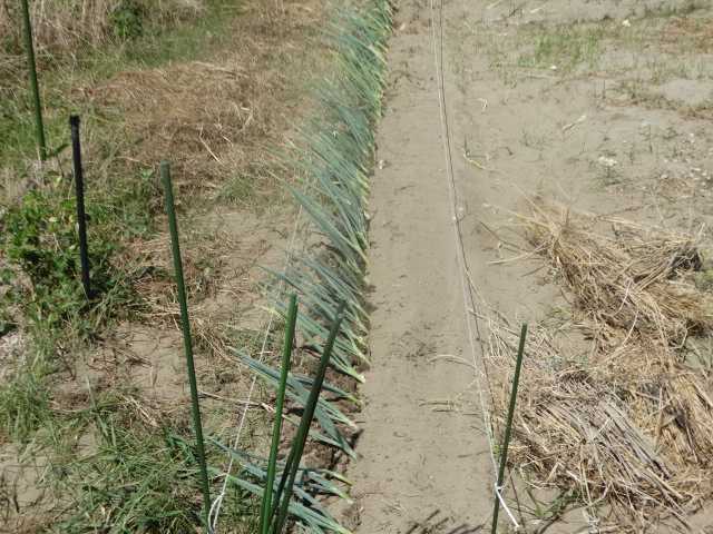 作ってあった畝の真ん中に溝を掘って10Cm間隔で苗を置いて行きます