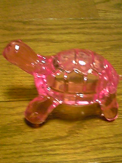 前の日記で100円均一に行った事は書きましたが、こんなモノも購入しましたピンクカメ~~~実は昔から亀グッズは少しずつ集めてたんですよねぇ~。なぜか民族チックなお店で売ってることが多いです。手前の方の小さぃカメさん達はほとんどお香立てなんですよコチラは最近ダーリンに買ってもらったビニールバッグタートルズ(☆∀☆)主に図書館バッグやサブバッグとして使用してますめちゃくちゃ気に入ってますピンクカメさんはお風呂場に置くのだぁ(^^)本当は『ツボ押し』らしぃから、湯船に浸かりながら、まったりカメ押しTIME・・・なんか素敵ぢゃなぃの
