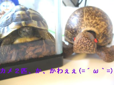 久方ぶりの更新です・・・最近、人に会う事が多く、元来ヒキコモリ気味のさぁ-こは少々お疲れ気味でござぃますε-(;ーωーA フゥ…でも、みんな誘ってくれて嬉しぃンですよ嬉しすぎて、お花見のときに日本酒呑み過ぎて転倒とか、挙句、擦り傷&打ち身で緊急病院行きとか、レントゲンとか・・・(;´ρ`) グッタリ証拠写真あーもぅ自己嫌悪ループで、少女漫画読みふけって(メイちゃんの執事)、執事萌えとか、現実逃避とか、どんだk・・・・・・今週は禁酒です(自粛中)それはさておき、最近またカメグッズ購入してきました小亀を引っ張ると親亀の前足が回って泳ぐらしぃーーカメチョコカメグッズに目がなくなるのはカメ飼いの性分でしょうか・・・ちなみに本物の方最近やけに歩くのが早いですね( ´∀`)すたすた歩く姿がやけにカッコ良く見えるよ・・・キュン(親バカ)