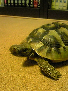 水入れプールを楽しむミケ少年。この写真は先日撮ったものだけど、今日はこの中で卍寝してた(*´ー`) フッすかさず写真を撮ろうとしたら、ギラついた視線に気づいたのか、速攻で動き出してしまった(∩゜∀`∩)キャ━━ッ!! カメラカメラ!!! ヾ(。`Д´。)ノ彡☆ブーブーッ!! なんで動くだよ!!まぁ、 \(・д\)それは(/д・)/ともかく最近のミィ様がお元気ですんばらしぃンですよー北へ南へ、東へ西へ、とにかく良く歩く。ウチにやってきた時もとても元気な様子でいたけれど、最近は段違いに動く。ヾ(゚ー゚ヾ)~アッチヘフラフラ・・・~(ノー゚)ノコッチヘフラフラ・・・動くのが楽しぃみたぃに見えるそんな中、よく見ていると・・・カーテンの下を何度もくぐってみたり、ビニール袋の横をわざわざ通ってみたり。(ビニール袋のカサカサッって音が気になるのかな??)・・・なんて面白いんだッッΣ(゚□゚(゚□゚*)友達とかに「リクガメ飼ったんだ~」と言っても「寝てばっかりでつまんなそう」と言われ続けた私。『めちゃくちゃ動いて面白いッすよ~~~』と、声を大にして言いたぃ、今日この頃でございます。