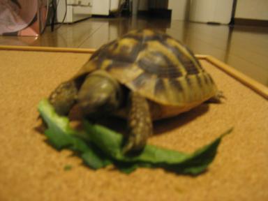 今日の午前2時半過ぎ、いろいろな方の亀さんブログを一通り拝見しいざ寝ようとしたその時・・・・・・『ガサガサガサガサ・・・・・・』ミィたん、目覚めるこんな時間に起きんなーーーーー甲羅がガラスにぶつかってうるさいので、しかたなく、部屋に出すと・・・明らかにゴハン探してるッ!!!愛亀のお願いを断るわけにもいかず、しぶしぶ小松菜1枚とサニーレタスを少しちぎってやると、めっちゃがっついてるーーーーーーΣ(゚ロ゚;)夜ご飯、イッパィ食べてたぢゃーんわ す れ ち ゃ っ た の か ぃ ? ?暖かくなると食欲も増すらしぃけど、『肥満亀』になってしまうのではと今からとても心配です(;´Д`)