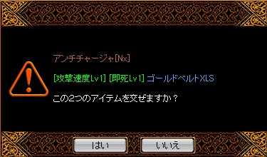 今の良品は高くて買えないから仕方ないね。~そういえば、また下らないことしました~→単OP聖騎士マイン。破壊。こっちは真面目ですよ割と。T回避セーフが出回ってるけど、個性がないのでCP効率を選択しました。お守りであと一個回避を付けたら完成。Nセーフでも現状の狩場で困ってないけど、こういうのは気持ちの問題。~過去の良品~◆比率バイザー保護委員会運比に続いて、健康比も買っておきました。買ったら健康比バイザーがもう一個同じ露店に出てきてビビった。そちらも売れたようだ。運比バイザーと違ってこっちは出回ってるから、まぁ絶滅はしなさそう。◆T速度フォムずっと気になっていたT速度フォムがやっと出回ったので購入。これすごく良い!!戦士の狩りがとても快適になりました。しばらく手放すことはなさそう。◆Tダメバターシフ武道兼用手袋にならないかなぁと買ってみたんですが、武道だとIF3にも負けることが判明。とても悲しいので売りに出しそう。勇猛入ってるしドラツイ用繋ぎ装備だったのかなぁ。……あとは、過去のコラボ品が気になる今日この頃。具体的には凛ペンと金剛黒帯。もうちっと安くならんかね。