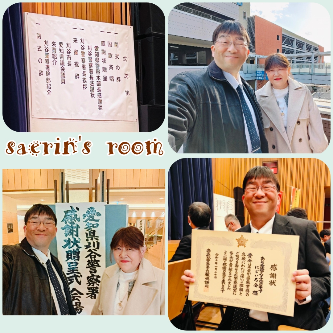 実は今日は午前中に表彰式があり、午後から今年初めてのボランティア活動があるためブログを書く時間がないのでお休みしようと思っていたのです。ところが思いの外表彰式が早く終わったので、午後からのボランティア活動の前に一度家に帰って来れたのでちょっとだけブログを書くことにしました。今日は愛知県刈谷警察署の感謝状贈呈式が刈谷市アイリス小ホールで行われました。にじいろ会は交通安全啓発活動で今年で3度目の感謝状をいただきました。これもボランティアメンバーさん方が頂いたものだと心から感謝しています!!そして活動には参加されなくても多くの皆様からの材料のご支援やご寄付をいただいてこの活動が継続できていることに心から感謝いたします!!本当に皆さんにいただいた感謝状に心から感謝でいっぱいです✨ちいたんさん毎月定期的にAmazon「みんなで応援」プログラムで材料のご支援を送って下さって本当にありがとうございます!!心から感謝いたします(^-^) 午後1時半からは知立市で今年最初のボランティア活動です。急いでお昼ご飯を食べていってきまーす(*^^*)久しぶりにメンバーさん方にお会いできることがとっても楽しみです✨ご訪問いただきありがとうございます!!いつも温かいコメントありがとうございますさえママへのメールはこちらからにほんブログ村、応援おねがいします!!この「さえりんの部屋」を一人でも多くの方に読んでいただき、交通死亡事故で悲しむ人がもう増えませんようにと心から願っています!!さえりんをクリックしてください!! にほんブログ村人気ブログランキングよろしければこちらも応援おねがいします。さえパパの「可愛いさえりん1分間動画💛」ぜひ見にきてね!!さえりん動画はこちらさえりんの部屋別館にじいろ会公式ホームページが完成しました!!よろしければ以下のリンクからご覧下さい。https://saerinsaeri.wixsite.com/aichinijiirokai