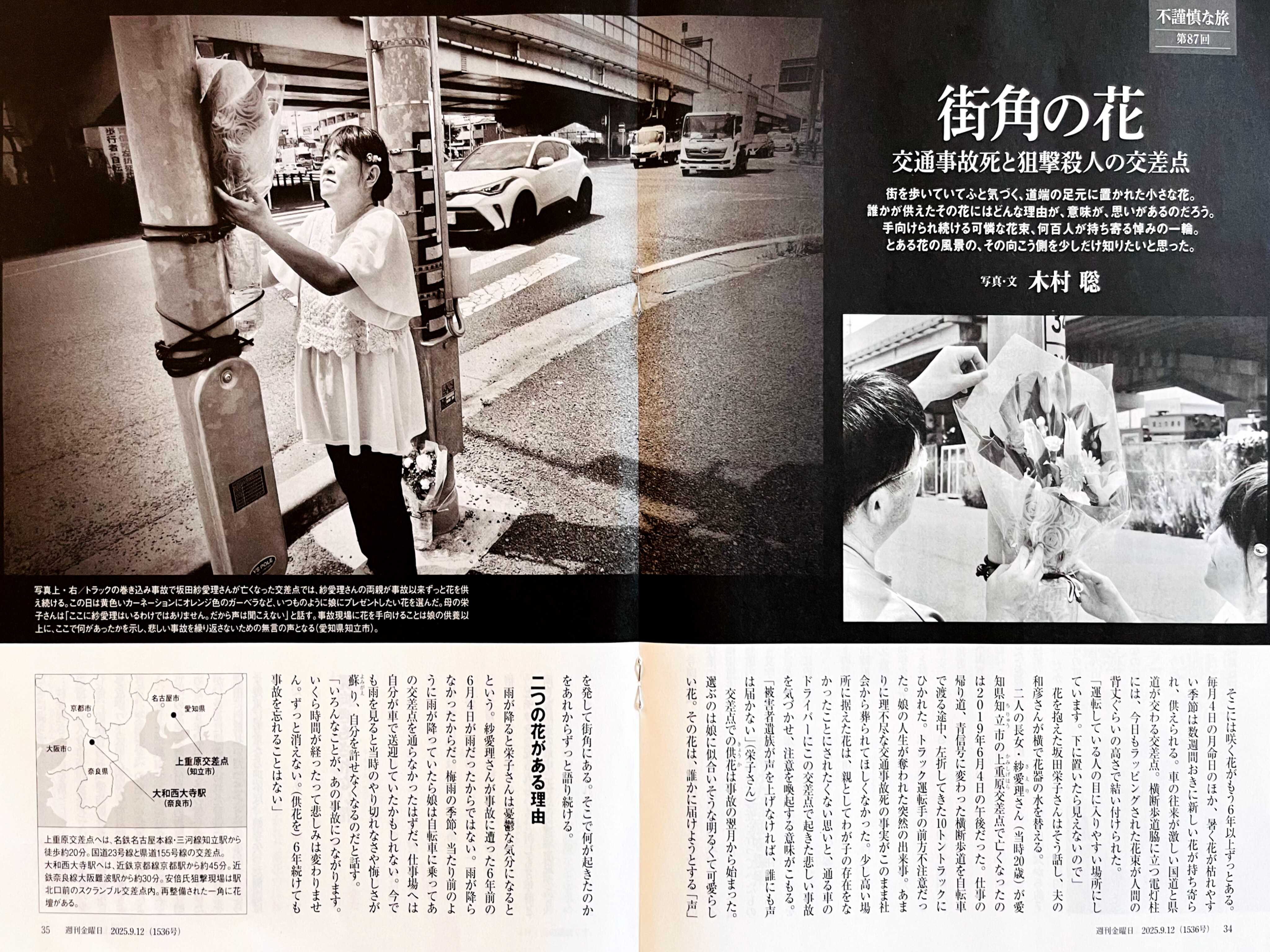 一昨日我が家に「週刊金曜日」という雑誌を送っていただきました。それは今年7月に東京から雑誌記者の方が取材にみえてその時の記事が掲載されたからです。(週刊金曜日 木村聡記事より引用)『街角の花』交通事故死と狙撃殺人の交差点街を歩いていてふと気づく、道端の足元に置かれた小さな花。誰かが供えたその花にはどんな理由が、意味が、思いがあるのだろう。手向け続けられる可憐な花束、何百人が持ち寄る悼みの一輪。とある花の風景の、その向こう側を少しだけ知りたいと思った。写真・文 木村聡そこには咲く花がもう6年以上ずっとある。毎月4日の月命日ほか、暑く花が枯れやすい季節には数週間おきに新しい花が持ち寄られ、供えられる。車の往来の激しい国道と県道が交わる交差点。横断歩道脇に立つ電灯柱には、今日もラッピングされた花束が人間の背丈ぐらいの高さで結い付けられた。「運転している人の目に入りやすい場所にしています。下に置いたら見えないので」花を供えた坂田栄子さんはそう話し、夫の和彦さんが横で花器の水を替える。二人の長女・紗愛理さん(当時20歳)が愛知県知立市の上重原交差点で亡くなったのは2019年6月4日の午後だった。仕事の帰り道、青信号に変わった横断歩道を自転車で渡る途中、左折してきた10トントラックにひかれた。トラック運転手の前方不注意だった。娘の人生が奪われた突然の出来事。あまりに理不尽な交通事故死の事実がこのまま社会から葬られてほしくなかった。少し高い場所に据えられた花は、親としてわが子の存在をなかったことにされたくない思いと、通る車のドライバーにこの交差点で起きた悲しい事故を気づかせ、注意喚起をする意味がこもる。「被害者遺族声を上げなければ、誰にも声は届かない」(栄子さん)交差点での供花は事故の翌月から始まった。選ぶのは娘に似合いそうな明るくて可愛らしい花。その花は、誰かに届けようとする「声」を発して街角にある。そこで何が起きたのかをあれからずっと語り続ける。二つの花がある理由雨が降ると栄子さんは憂鬱な気分になるという。紗愛理さんが事故に遭った6年前の6月4日が雨だったからではない。雨が降らなかったからだ。梅雨の季節、当たり前のように雨が降っていたら娘は自転車に乗ってあの交差点を通らなかったはずだ、仕事場へは自分が車で送迎していたかもしれない。今でも雨を見ると当時のやり切れなさや悔しさが蘇り、自分を許せなくなるのだと話す。「いろんなことが、あの事故につながります。いくら時間が経ったって悲しみは変わりません。ずっと消えない。(供花を)6年続けても事故を忘れることはない」花を供える栄子さんの足元には、もう1つ別の花があった。こちらも毎月4日、新しい花束が換えられ置かれ続ける。栄子さんはそれを「一刻も早く事故を忘れたい加害者」のものだと言った。事故の加害者となったトラック運転手自身が、紗愛理さんの月命日に事故現場へ足を運び花を手向けることは、刑事裁判で自らが遺族と交わした約束だった。判決は2020年に言い渡され、実刑(禁錮3年)ではなく執行猶予(5年)が付いたのは、おそらくこの約束も影響したはずだ。しかし、刑事裁判に続いて行われた民事裁判後、ほどなくして加害者は現場の花を持っていくのをもうやめたいと申し入れてきたそうだ。「私にはどうしても故意に命を奪ったとしか思えない」と栄子さんは現在も事故自体に疑念を抱いている。それはとりもなおさず加害者に対する不信感からだ。事故の際、トラックは紗愛理さんと衝突後、すぐ止まらずゆっくりと走り続けたと検証されている。これによって紗愛理さんは頭部を巻き込まれた。ながら運転も疑われたが、ブレーキの遅れにについての問いかけに加害者は「頭が真っ白になってよくわからない」と答える。償いや誠意を感じることはなく、事故を忘れようとする加害者。それでも「過失の程度は重くない」とした裁判所の判断は、事故同様、遺族にとっては理不尽さに満ちていた。紗愛理さんが命を落とした上重原交差点は以前から人身事故が多発していた。事故の少し前に娘が言った「愛知県はなんで交通死亡事故がワーストなの?」の言葉が母の頭をよぎる。交通安全への願いを娘から託されたように感じた。坂田さん夫婦は危険なこの交差点への歩車分離式信号機の設置を呼びかけ始める。3年がかりでその信号機は設置されたが、最初に請願に訪れた警察では渋滞発生を理由に門前払いだっただ。事故がもたらす幾重にも重なる理不尽。娘を失った両親は言葉をそろえる。「だからあそこに、あの花はなくてはならないんです」 この雑誌の記事を読んで本当に短い取材時間だったのに、すごく私たちの想いを的確に記事にして頂いて心から感謝しました!!この記者さんは過去に新聞に取り上げられた記事や私のブログを見つけてご連絡をいただいたのです。こんな有名でもない交通事故の一被害者遺族の声に気付いてくだ