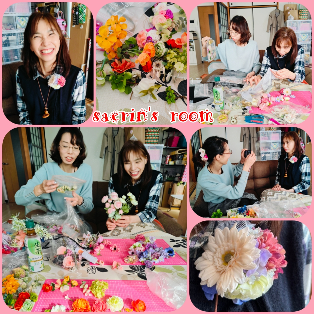 急いで帰ると午前10時過ぎで、A先生とSさんはもう我が家に到着してさえパパがいたので家に上がってもらっていました。早速花デコレッスンスタートです!!Sさんは花デコ初体験で娘さんにお孫さんの卒園式用のコサージュをプレゼントしたいとコサージュを作ることに。 私は今回はガーランドに挑戦です(^-^)