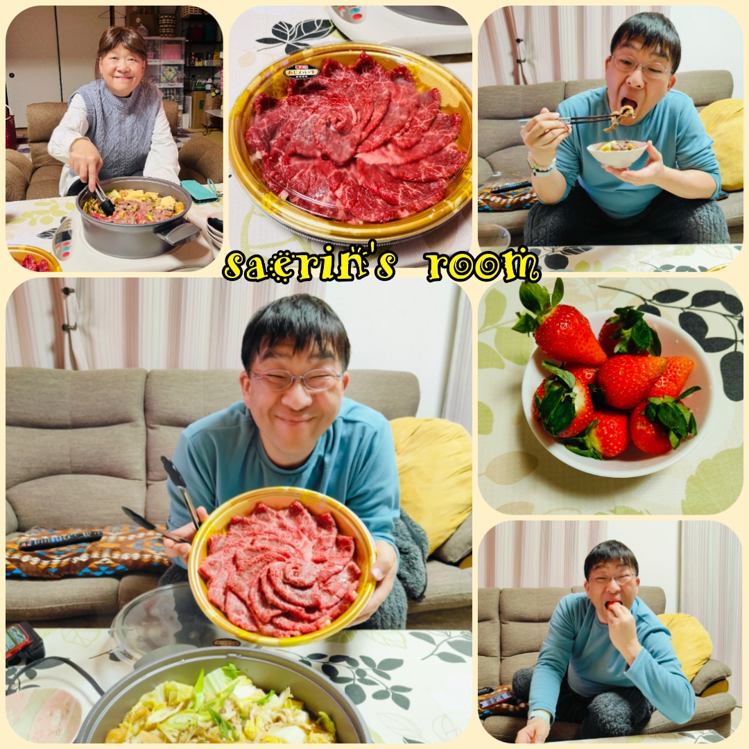 前の日にくらさんちーさんから滋賀県産のあじわい牛をいただいたからです。本当は次女も一緒にと思いましたが次女は職場の友達たちと遊びに行って晩ごはんも食べてくると言っていたのでさえパパと2人でいただいちゃいました。柔らかくて味わい深くてとっても美味しかったです(≧▽≦)さえりんのお供えに頂いたイチゴもデザートでいただきました。 くらさんちーさんありがとうございました!!