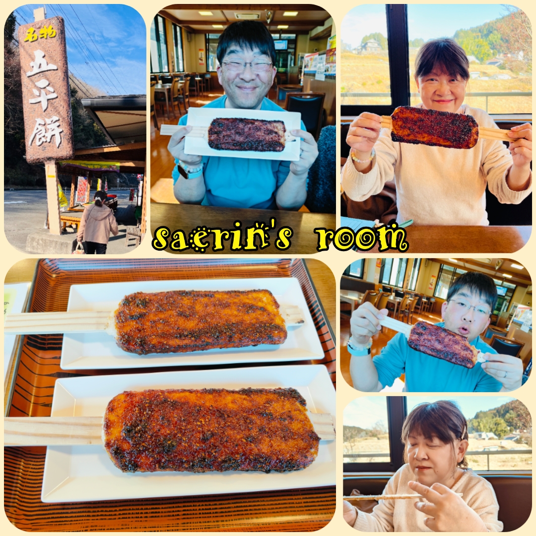 仕方なく少し戻って「五平餅」と大きく看板が出ている 「しもやまの里」へ行きました。 先回も観光センターが閉まっていてガッカリしてこのお店で五平餅を食べたら大きくて美味しくて観光センターのとあまり変わらなかったから。外には産直野菜が売っていてもう売り切れてあまり残っていなかったのですが立派な白菜が1玉300円だったので売店で買い、食堂スペースに入って五平餅を2つ注文して遅めのお昼ご飯にしました。いつもと変わらず大きな五平餅が1つ450円で最近の米の高騰でも値段が変わっていなかったのでホッとしました。もっと昔は350円でしたが💦 ​美味しい五平餅が食べれたのでひとまず満足でした(≧▽≦)​ ​​