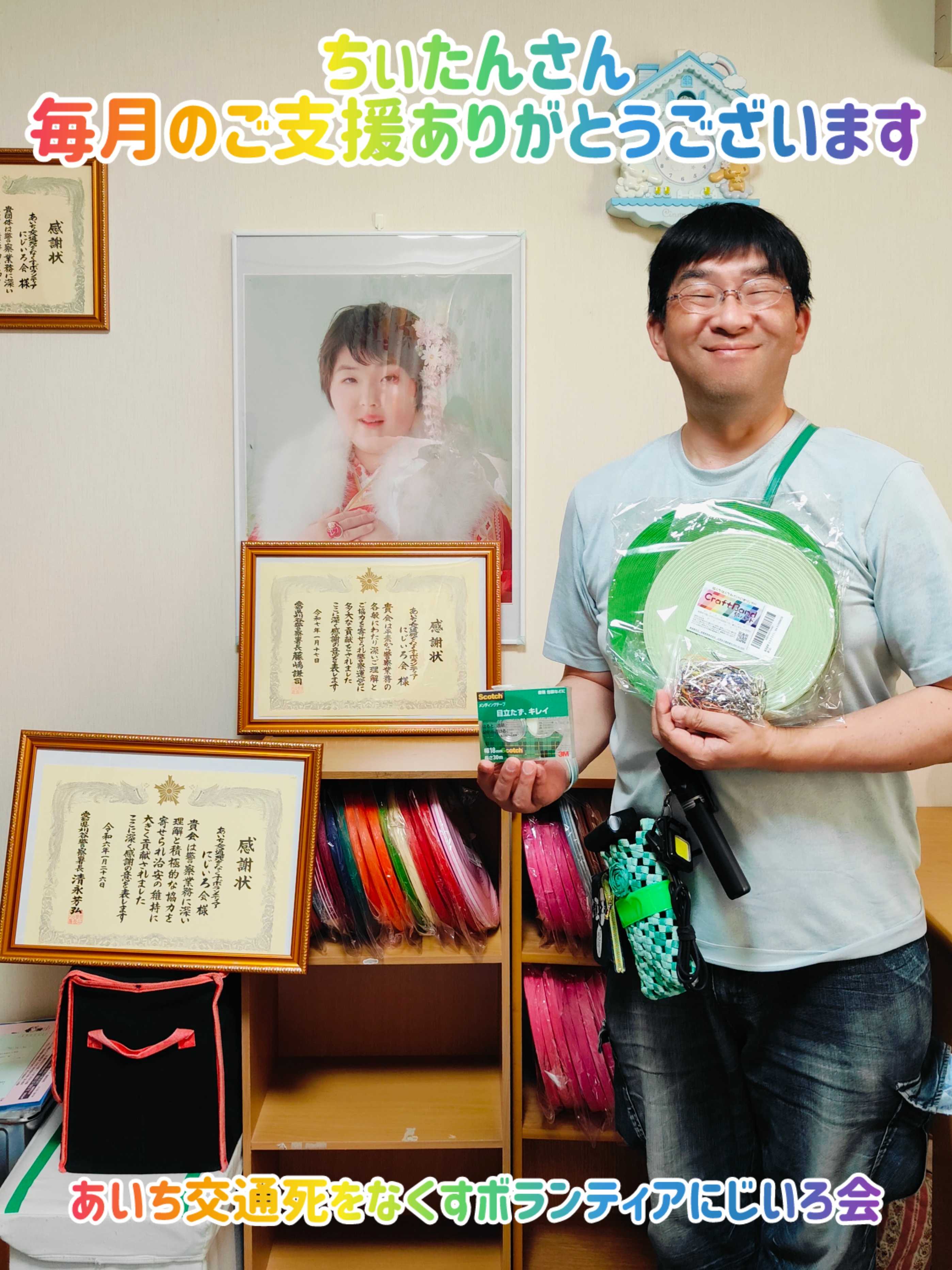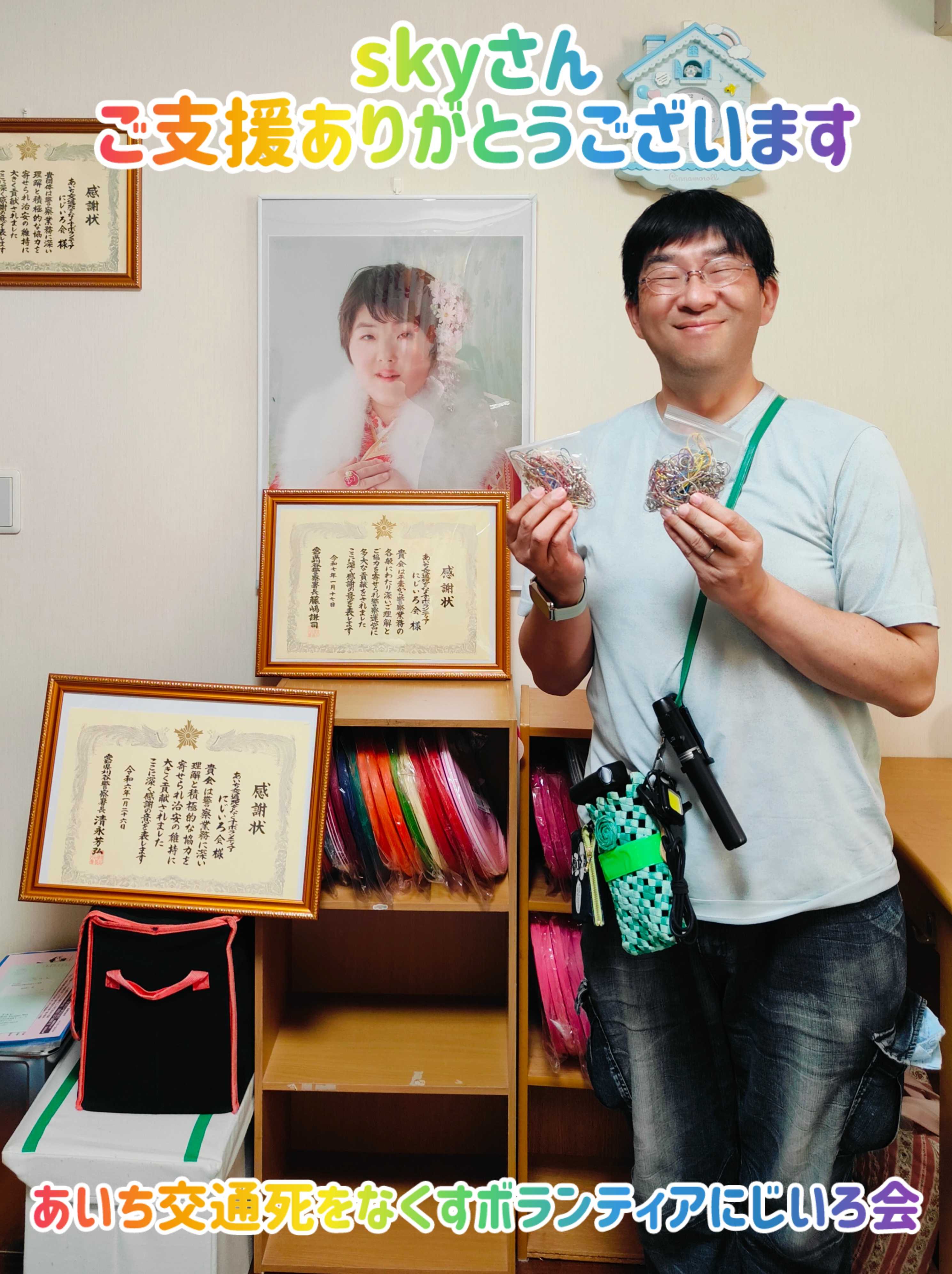 昨日はみんなで140個のストラップを作って車の中にあった80個の完成品と合わせて 約220個のストラップをメンバーのSさんが帰りに安城警察署へ届けてくれました!! 安城警察署の担当の方からも「出来たてほやほやのストラップを届けて下さってありがとうございました!!」とお礼の電話ももらい、Sさんからも「届けました!!」とLINEがきました。 助かりました、みんなありがとう!!