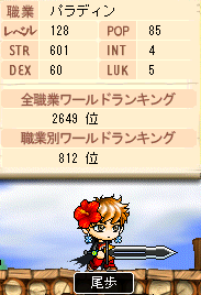まさか前後編になるとは思わなかった。というわけで前編には前編ついてません。というわけで続きいきまーす。アレです。ストライカーね、エネルギーチャージしてバスターしたら5400出るようになったんです。レベル54で。ちなみに、54でおキツネ様倒しました。妖孤は近距離じゃ呪いが鬱陶しいからハーミットで狩ることにしたんです。で、バスターは3体攻撃なのに5400て。強すぎねぇ?絶対ゴレ森狩ってた時のパラディン(当時ページ)のパワーストライクと同じくらいの破壊力だ。と、思って当時の記事を探してみた。2006/9/9 2006/9/10はい。古すぎて画像が無い。そして、ダメージも残っていない。そして、文章が少し恥ずかしい。仕様ですが。でもね、ゴレ森で60台ってことで大体合ってる気がします。そしてぱわすとと同じ程度の破壊力。54レベで。ただ計算するとですねぇ。騎士団は1レベごとにAP6×54レベで普通のキャラよりSTR54多いです。ページ素DEX60(今も)ストライカー素DEX20なので40多いです。94多い→19レベ分程度。ということで足すと73レベとほぼ同等のSTRです。祝福が攻撃13ですが、武器が50レベということを考慮に入れるとほぼぴったり?だがしかし、スキルの性能というか、3体攻撃は強いけど、チャージが溜まるまでがなぁ。6体巻き込むと10発でチャージが溜まりました。ケーキで試しました。チャージ溜まってる状態のバスターでタゲとって集めて、チャージ切れたらムーンサルト連射!で、10発でした。だからといってストレートだと60発で溜まるかは微妙。チャージはアレ時間と共に徐々に減って行くっしょ?アレの基準がわからん。モンハンの太刀の練気みたいな感じで最初の一撃から一定時間で減り始めるのか。それとも、1発殴るごとに一定時間が回復するのか。(つまり殴り続けてる間減らない)モンハンの太刀は1度減り始めるとMAXになるか0になるまで徐々に減るのが続くんです。なのでちょっとしか溜まってないときは潔く諦めて0になってから攻撃するのがいい!って何故モンハンの話に!?とりあえずストライカーです。えっと。今日は55レベってことでそれ以上の奴を狩りたいです。ホンスタは欲しいですが、妖孤は呪いがめんどいので56レベですがパス。57?のゴレ森に行きたいと思います。問題は、軍営もいいんですが、弱いほうは57で強いほうは60以上ということ。ふむ、いつまで篭ったものか。サイティもアレなかなかわき良いっちゃいいんですがそこまで量が多くなくMAPが狭い。沸き待ちみたいな時間が多少。ジェネシスとかしたら面白かったぜ!で、サイティは67レベなんでしばらく大丈夫そう。MC2はいつでもいけるので10万匹達成してからにしたいと思います!追記/*ごめんなさい、後から見てみると書いてる順番がばらばらなので意味が通らなくなってますね。下のほうまで読んでもらうとわかります。ごめんね!*/ここまでちなみに、さっきの9/10の翌日であり、ちょうど3年前今日の9/11ですが今現在でもパラディンが愛用しているSTR12ATK107のグリュンヒルの誕生日みたいです。今気づきました。はっぴばーすでいとぅーゆーはっぴばーすでーでぃーあぐーりゅんーはっぴばーすでぃとぅーゆーまさか、3年間も愛用することになるとは。だがしかし、グリュンにしては強いんだから!それにグリュンのデザインも気に入ってるし!俺シンプルでゴツい剣大好き!きっとこれからもしばらくは愛用され続けることでしょう。メーカーでいいのが出来るまで・・・。いいのが出来ても、別キャラに受け継がれていきます。弟キャラのソウルマスター?とか。ま、3次するのか怪しいところですけどね!で、俺のストライカーがころころと狩場を変えてるのには理由があって狩りサボってんのになかなかいいとこまでいってんですよねぇ。経験値にもならなさそうなのにあえて妖孤を吸ってたのはコレのためです。ただ、勲章の性能知らないんですけどどうですか!いいですか!?だがしかし、ここまできたら引き下がれないぜ。やってやる!やってやるぞ!でも、これから学校始まるのに大丈夫なのか。そしてドイツ語の課題の運命や如何に!?続く!というわけでおしまいでっす!