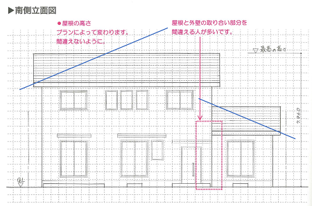 立面図を描く時最高の高さを求める必要が出てきますがその高さを下図の青い線のように斜めの線を引いて出す人がいます。最端エスキース・コードよりこの線図面上にはっきりと残ってしまうと、図面の見栄えが悪くなってしまいます。できればなくしたいです。では、どうすればなくせるか。方法はいくつかありそうですよ。kanna