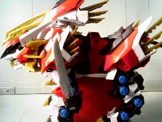 ゾイドジェネシス登場のハヤテライガーです。主役機のムラサメライガーがエヴォルトした機体です。これは以前に、近くのおもちゃ屋で半額以下で買ったものです。ワンタッチで背中のブースターが展開します。色は派手なので見栄えがいいです。スタンドも付属していました。 やや気になったのは、左右に装備されたムラサメディバイダーとムラサメナイフ、およびブースターの羽が軟質素材でできているためにやわらかすぎることです。