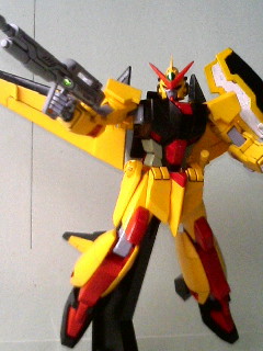 1/144 ムラサメ(バルトフェルド専用機)です。部分塗装して、角をちょっぴり伸ばしました。量産機より先に発売されていたのでミサイルはついていませんでした。黄色い機体はあまりないので、印象的でした。