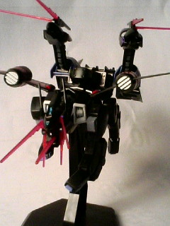 1/144 ケルベロスバクゥハウンドスターゲイザーに登場するバクゥの上位機です。ウィザードシステムに対応することで、機体利用を延伸させたという設定です。ブルデュエルを撃破した近接戦用機。 かなり稼動範囲は広く、様々なポーズが取れます。写真では、汎用スタンドに取り付けています。(キットには付属しません)上方から。ビームファングは全てクリアーパーツで再現されており、展開状態では凶悪がイメージです。頭部にはビーム発信機が5基あります。下あごも開くことが出来ます。シンプルモードにするとこんな感じです。ビームパーツは全部で9つ。首の部分は、リード線接続でフレキシブルに可動。もちろんケルベロスウィザードは取り外しが出来ます。側面。翼のラインはモンザレッドで塗装。マスキングしたのにもかかわらず、はみ出てしまい、少し汚いですがご容赦下さい。ウィザード対応のためのアタッチメント。ケルベロスウィザード。頭部横のパープルの部分と肩アーマーのような部分のグレーは塗装です。首や手足の接続はボールジョイント。首内部のビーム砲も再現されています。四肢を折りたたみ、無限軌道走破形態にもできます。バクゥ好きにはたまらないでしょう。(笑)かなりコンパクトになります。無限軌道(キャタピラ)はゴムパーツでできています。首の動力パイプもです。背面画像頭部のモノアイはシールで再現できますが、やや径が小さかったので付属のホイルシールの余りから切り出しました。普通よりかは光を反射します。四肢の付け根はダブルボールジョイントなので、接地性はバツグン!胴体の前後も引き伸ばして曲げられます。ジャンプして飛び掛ろうとするポーズも取れます。ビームファングは取り外してMS用手持ち武器になります。連結状態のものも付属。ウィザードに対応しているザクやドムに装備ができます。 バクゥハウンドは黒い装甲なので、どこに何があるのかパット見、分かりづらいのが実情です。(涙)でも、地獄の番犬に相応しい凶暴な風貌が魅力でもあります。二足歩行のMSに比べて小さく感じますが、ギミックは多数ありポージングの幅も広がります。また、最近ノーマルのバクゥも発売されてのでそちらもオススメです。レールガンとミサイルポッドの両方が付いています。ちなみに劇中登場の初期型には、ビームサーベルは装備されていませんでした。最後に、撮影には大きな事務用ファイルとカレンダーを使用。クリップで留めています。携帯の写真なので、やや粗いですがご勘弁を。でも今使用している携帯は、USBケーブルでパソコンに接続できるのでとっても楽です。