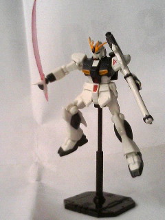 HMS6よりνガンダムを紹介します。この間はヤクトドーガを掲載しましたが、今回ニューガンダムを入手(洒落かよ!)できましたので載せますね。武装はニューハイパーバズーカとビームサーベルです。スタンドもついとります。バズーカ発射ポーズも決まりますね。ちなみに背部にセットできます。なにやってるのかいまいち分かりませんね・・・・一応パンチしております。ビームサーベルの両手持ちです。結構きまります。サザビーが欲しいところですが、ヤクトドーガで。空中戦もよろしいかと。