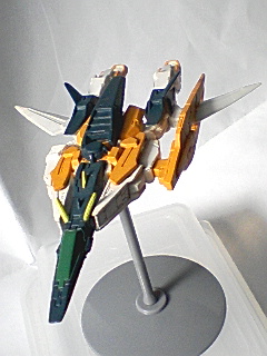 今日はキュリオスとヴァーチェを紹介しますだ!!皆様が見慣れているキュリオスの飛行形態です。上半身だけ変形とかできるんですね・・・一応シールドとライフルが付属。裏から。身がぎっしり詰まってる感じ。なんか海老っぽい。変形機構は確かに、新鮮ですね。オレンジがいい色合いです。オレンジ・・・・ジェミリア・・・んで、MS形態がこちら。かなりかっこいいです。この弾ではイチオシですね。サーベルの構えが決まったポーズです。とんがりくちばし。ガンダムヴァーチェ。バズーカが付属しないのが辛いですが、GNキャノン発射形態が再現されてます。ちなみに、発射時には砲身が伸び、上部カバーが上にスライドします。足横のパーツはGN粒子発生装置です。この装置が各部にあるおかげで、ビームバリアがはれます。今日はここまで。次回はティエレンで行こうかな?小隊が編成できました。
