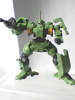 今日はティエレンを紹介。ティエレンは中国語で鉄人。ピンインで読むと英語読みに近い発音となりますね。長滑腔砲装備が一般的なティエレンです。無骨ですが、ボリューム感があります。ちなみに、デザインはコードギアスのメカデザさんと同じです。背面。後ろにカーボンブレードを装備。こちらが、ハーフアソートの片割れ。カーボンブレード装備。腕の可動範囲が広いので結構動かせます。ガチャ単品とセットを組み合わせ、ティエレン小隊結成。「行くぜ!」「行くのかよ?」「援護よろしくゥ!」「なんだ、あの戦闘機は?MS?」「いいから打ち落とせ!!」「なにいーっ!!」「一撃でこの俺が・・・・」「ヴァーチェ、敵機を溶解する・・・」「デュナメス、狙い打つぜ!!」「くっ、囲まれたか・・・・」「エクシア、介入行動を継続する・・・」「ス、スペックが違いすぎる・・・・」てな感じで、遊んじゃえますねぇ。量産期機はよかとです。次の弾にはイナクトとヘリオンがラインナップです。楽しみだ。