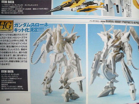 謎のガンダムが発表されました!!名前はガンダムスローネです。ソレスタルビーイングの新たなガンダムで変形します。僕は電撃ホビーマガジンで知りました。ちなみに、フレーテ=ナハトジークという20歳の男性がパイロット。そして、機体についてはこちらの掲示板をどうぞ!!一見するとデザインがレイズナーに登場しそうですが、ガンダムだそうです。一番近いというなら、Zの可変MSでしょうか?頭部と武装違いで、スローネの名を冠する3機が登場予定。換装するような気もしますがね・・・・長距離砲撃型のスローネアイン。近接型のツヴァイ。高機動型のドライが登場します。ていうか、ストライクの換装システムと同じじゃね?せっかく独自のデザインが良かったのに、前に戻った気がします。そもそも、イナクトのHG化もまだだというのに、新型ですか?アリーさん専用機を早く出して欲しいですね!