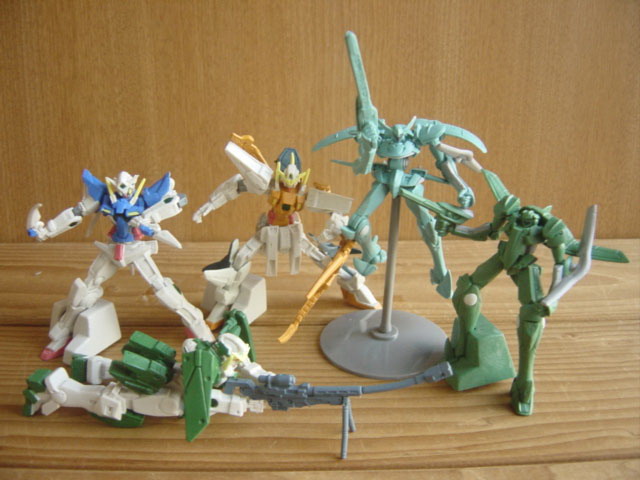 恒例のガンダムのガシャポンちなみに、登録商標としては「ガシャポン」が正しいです。その名の通り、販売機のハンドルを回してカプセルが出てくる擬音語を指しています。類義語に「カードダス」がありますね!って、説明する必要性なさげな話ですが・・・先日紹介したHGCOREガンダム02から商品画像をお届けします。実はこのシリーズ、MSセレクションの系譜を引き継いでいます。複数の間接パーツを差し替えることによって、ポーズ変えが可能。ただ、全てのキャラには採用されず、1体だけというのが悲しいですが・・・先の仮面ライダーシリーズでも手首などの差し替えギミックがありました。エクシア、デュナメス、キュリオス、イナクト(デモカラー、量産)、ヘリオン(指揮官機、量産)の全7種。量産機はダブってもいいですよね。キュリオスにはマルチジョイントを採用。GNシールドはシザーモードです。デュナメスはバイポッド展開で、狙撃形態でHG化です。イナクトデモカラーとヘリオン量産機を選択したセット(5種)イナクト量産機とヘリオン指揮官を選択したセット(5種)ちなみに、僕は今日まんだらけで取り置きを依頼しました。その時、「イク“ナ”トのセットですね。」と思いっきり間違えてる女店員。でも、先週も(←電王のアクションポーズ2)にも取り置きしたことがあったせいか、名前を覚えられていて、電話番号を言うのが不要でした。ご親切にも、今年と来年の営業日を教えてくれたんですが、イクナトの件は面白いので指摘しませんでした。そういえば前にも、モモ“タ”ロスを“モモ”タロスと読んでいた男店員がいました。まあ素人ですからね。でも、いかにも知ってそうな口調で言うのはやめて欲しいです。