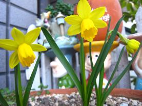 訪問して頂きありがとうございますまた、寒くなってしまいましたね。先ほど一瞬ですが雪がちらついていました去年植えた水仙が今年も咲きましたでもね・・・去年は確か、20cmくらいの大きさで、きれ~いに上向きで咲いてたのに今年は小さい。栄養不足?愛情不足?しかも花、下向き。控えめな私の性格に似た? (そりゃないね・・・ by息子)葉っぱが出てきて、少しづつのびてきた時は「まだかな~」「花咲くかな~」と楽しみにしていたんですが、一向に大きくならない。花はまだかと思っていたら・・・小さいのに蕾が出てきて・・・「おいおい」と思っていたら小さいまま咲いちゃった。超ミニ、下向き控えめな、水仙です。でも可愛いからいいか~にほんブログ村にほんブログ村