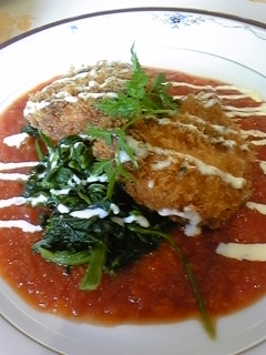 昼ごはんですかにクリームコロッケ・トマトソースですクリーミーなところとトマトの酸味があいまって旨かったです。 やはり何かお酒が欲しい所ですが、今日はガマンしました。お酒合わせるのなら、何がいいでしょうか?