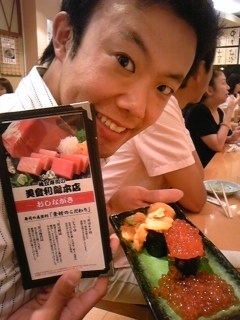 今日は暑いですね。食欲不振です珍しいでしょう?昨晩遅くまで飲んで食べてたからでしょ?って・・・当たりです昨晩は遅くまで、青煌(せいこう)杜氏の清水コーイチローと当店得意先を訪問してまいりました甲府着が1時過ぎ。 さて、ご紹介はまずはコーイチロー君が大学(東京農大)在学時、このお店の近くに4年間住んでた美登利寿司本館このすごいウニとイクラの盛りを見よ!こぼれてる、あふれてる?・・・いや、もう完全に別に大盛りだこれだけで酒のつまみになっちゃいます。田名部さんの握りで酒がすすみます 原田さんも忙しい中コーイチローの来店を歓迎してくれてありがとうございます!ホールの田村君!?、青煌を勧めてくださいね! 今度は私が青春の4年間を過ごした高円寺へゴー!!! 高円寺の憩いの店、明神丸さん!写真が甘くてスミマセン(汗)こちはら当店もう十年以上もの長いお取引をいただいているお店です。常連のお客様が多く、店主の坪井さんのお人柄が表れていますここのところ青煌の純米酒をたくさん取り扱ってくださっています。お客様を熱心な青煌ファンにしてくださり、コーイチロー君もとても感激しています。 店頭のちょうちんも個性的ですね。 店主の坪井さんは私と同い年で、いろんなところが合うんでしょうか。私もほんとうにくつろいでしまいます。以前、早瀬浦の三宅君を連れて行ったのもココです居心地がいいんです。高級なグランメゾンはもちろん素晴らしくとても印象的ですが、ここ明神丸は心地よさで負けませんだから長く愛されるんだと思います。 コーイチロー君も感激しきりで、もうこの笑顔!照れ屋のマスターもとってもやさしい笑顔居合わせた女性のお客様に、「あら♪めずらしい!なかなか見られない笑顔ね」とのこと感激!!今後とも長いお付き合いのほど、よろしくお願い申し上げます。11時も過ぎた頃、やっと車で帰途につきました。そう車です。飲酒運転じゃありませんよ! コーイチロー君の車だったので、彼は一滴も飲めませんでしたとさ大変ご苦労様でした